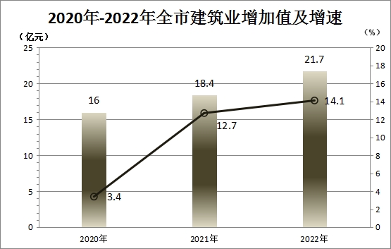 建筑业。全年实现建筑业产值70.18亿元,比上年增长11.4%,实现增加值21.7亿元,比上年增长14.1%。全市有总承包和专业承包资质的建筑业法人143户。