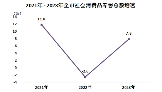 全年社会消费品零售总额同比增长7.8%。按经营地分,城镇消费品零售额同比增长7.7%,乡村消费品零售额同比增长8.8%;按消费类型分,商品零售额同比增长8.2%,餐饮收入额同比增长2.9%。