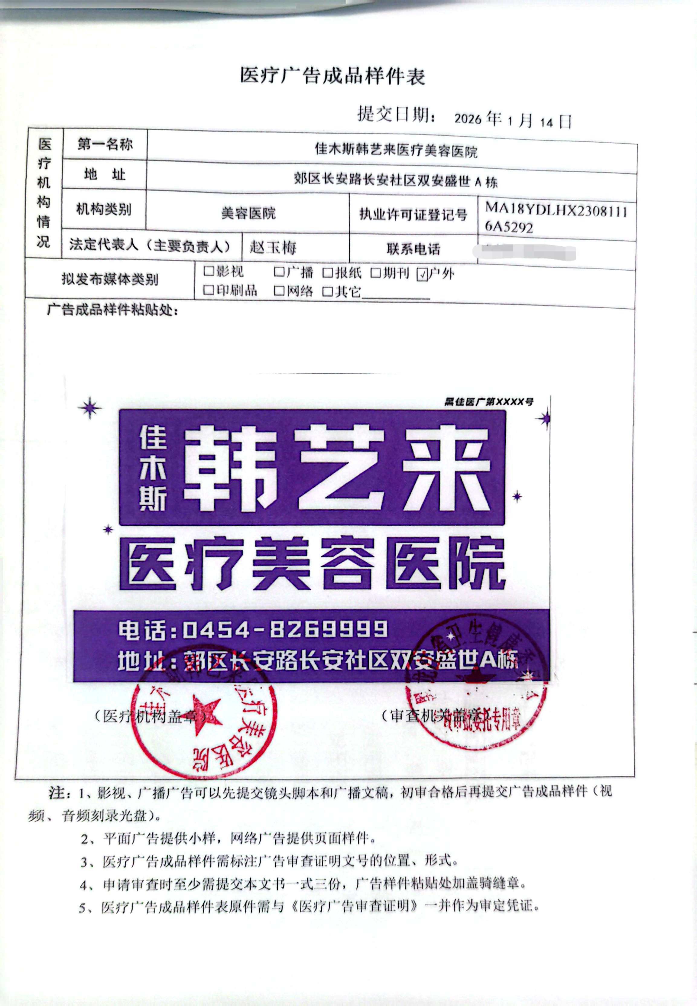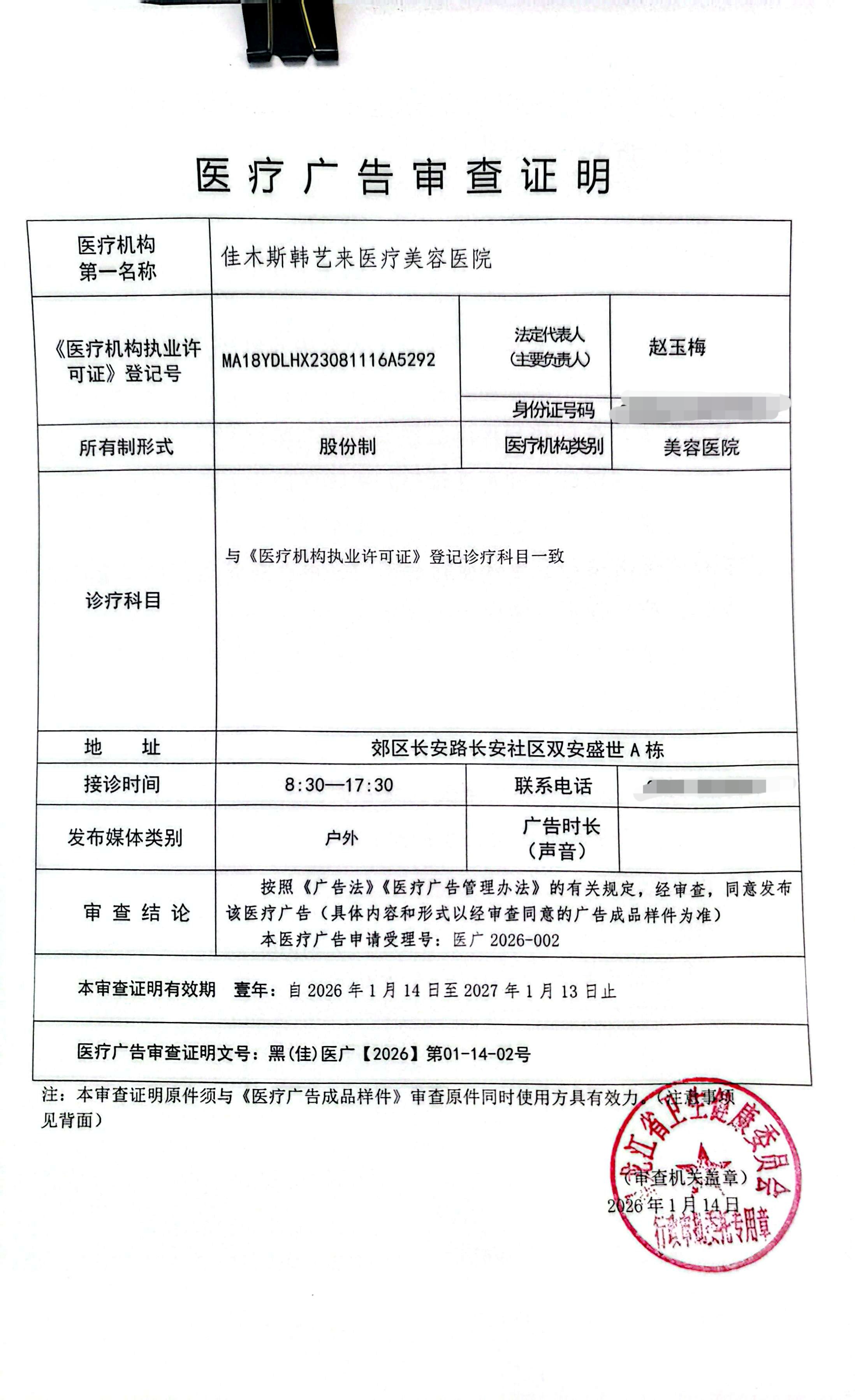 佳木斯韩艺来医疗美容医院2026.02医疗广告审批公示