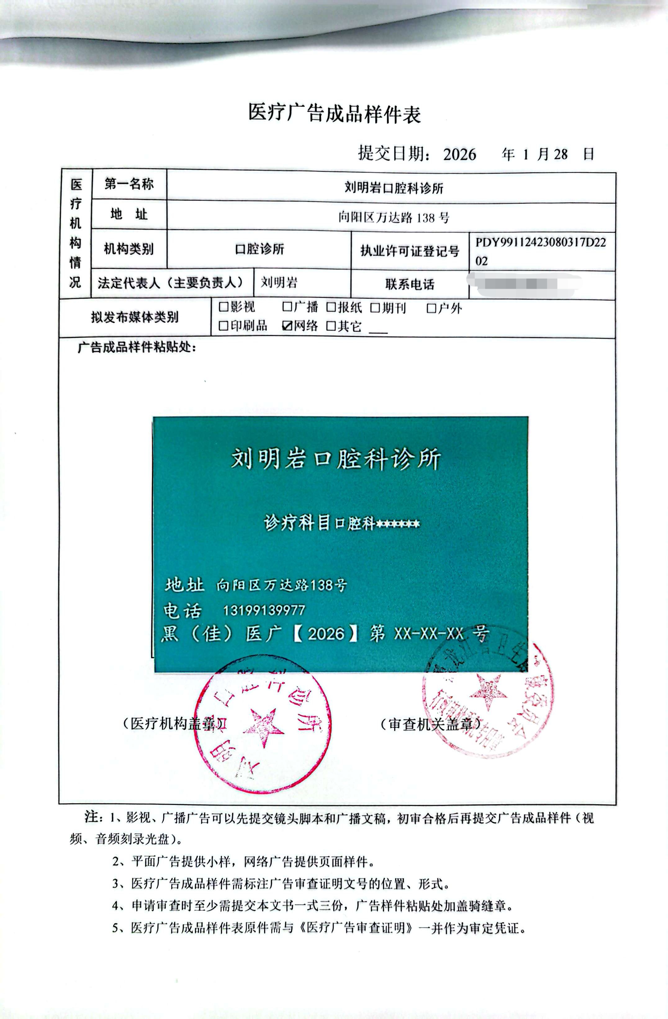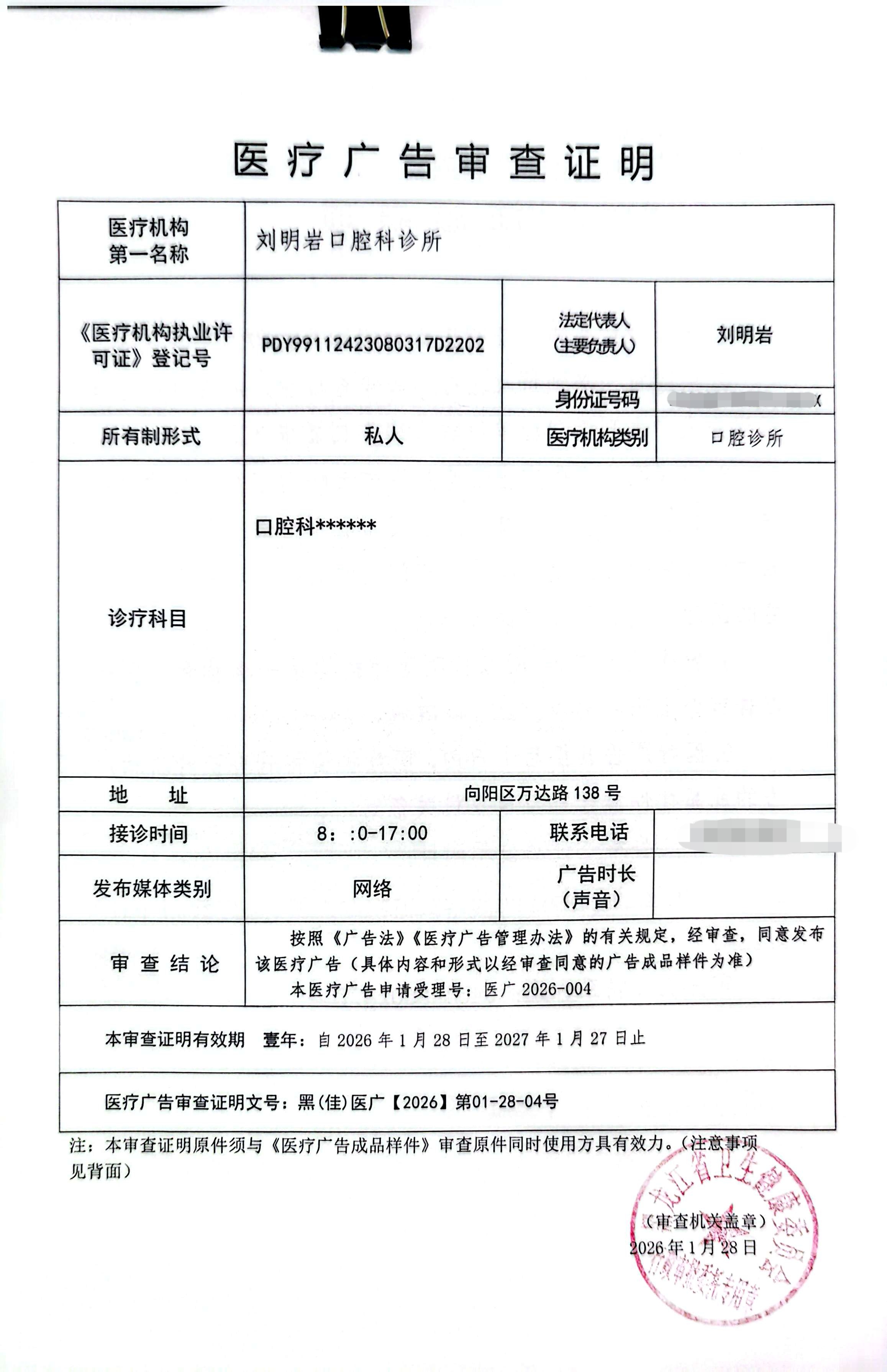 刘明岩口腔科诊所2026-04医疗广告审批公示