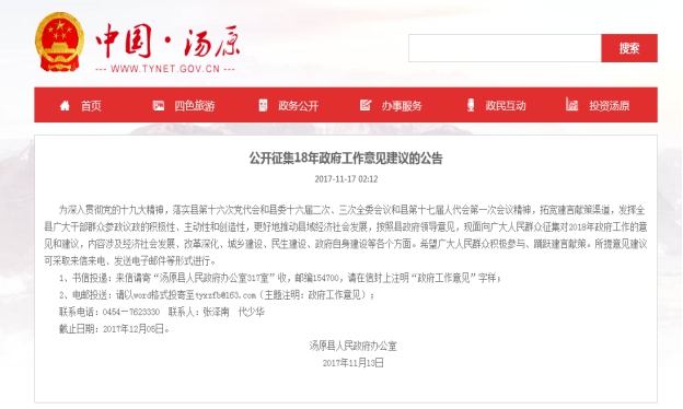 二是平台规范,公开渠道不断扩宽。大力推行网站集约化建设发展模式,于17年8月,督促汤原县教育网、汤原县红十字网站等5家部门网站进行了关停,实现功能的上化,达到网站集约化目的,方便群众查阅。不断强化政府门户网站信息公开第一平台作用,于17年9月,对政府门户网站进行了改版升级,为各乡镇、各部门开通了部门公开事项端口,各乡镇、各部门拥有了在门户网站自主公开信息的权限,满足了部门网上公开需求,做到“应公开、尽公开,应上网、尽上网”。充分利用“佳木斯汤原县”政务微博和“今日汤原”微信公众平台、广播、电视、便民服务大厅、新闻媒体、电子显示屏、展板、宣传手册、办事指南、公告栏、触摸屏等多种形式,因地制宜,构建多样化的公开渠道,最大程度地提高了政府信息公开工作的透明度,满足了人民群众获取和利用政府信息的需求。
