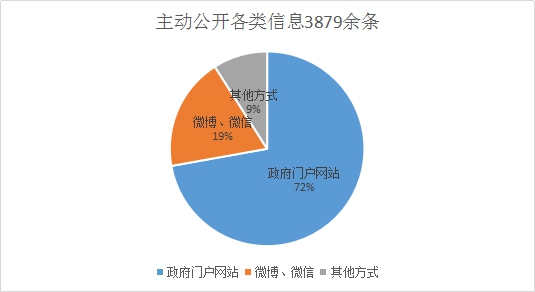 一年来,我县主动公开各类信息3879余条(不含重复信息)。其中:政府门户网站公开2800条,占总数的72%,微博、微信公开729条,占总数的19%,广播电视、宣传栏等其他方式350条,占总数的9%,较好的完成了各项工作任务。
