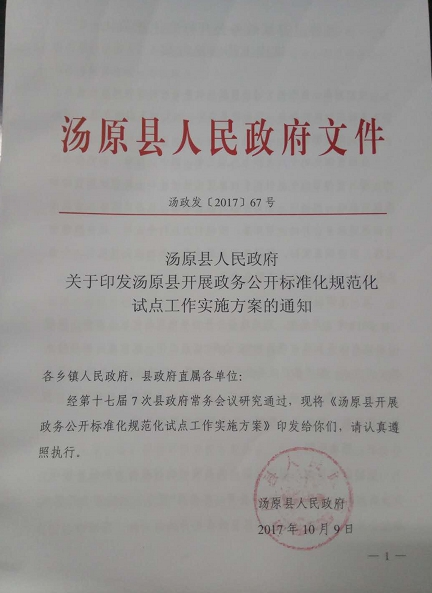 一是制定方案,明确任务。制定了《汤原县人民政府关于印发汤原县开展政务公开标准化规范化试点工作实施方案的通知》(汤政发〔2017〕67号)《汤原县政务公开国家试点事项梳理工作方案》,明确各项工作任务,落实工作责任。