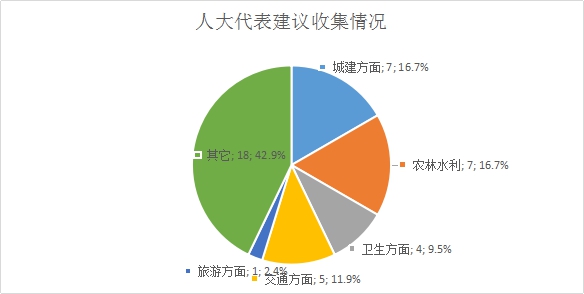 1. 人大代表建议办理情况。抚远市第二届人民代表大会一次会议期间,市政府共收到人大代表建议、批评和意见42件,其中,涉及城建方面7件,农业、林业、水利方面7件,卫生方面4件,交通方面5件,旅游方面1件,其它方面18件。这些代表建议、批评和意见在市政府的高度重视下,在各承办部门的积极努力下,已经办理完结或基本办理完结的建议、批评和意见28件,占所提建议、批评和意见总数的66.7%;正在办理的建议、批评和意见11件,占所提建议、意见和批评总数的26.2%;所提建议因政策、资金或其它原因暂不能解决或需经长期努力才能解决的为3件,占建议、批评和意见总数的7.1%。