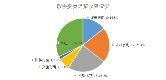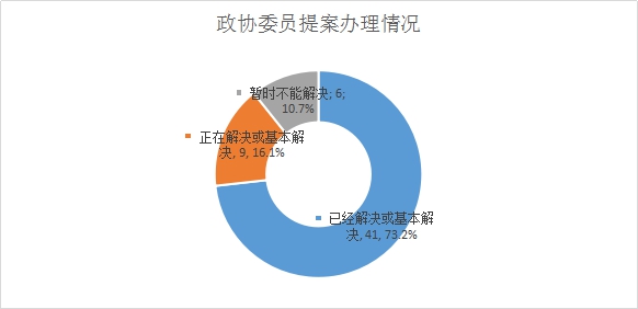 2. 政协委员提案办理情况。抚远市政治协商会议第二届委员会第一次会议期间,市政府共收到委员提案56件,其中,涉及城建方面8件,农业、林业、水利方面12件,教育、卫生、文化方面13件,交通方面4件,旅游方面1件,其它方面18件。所提问题已经解决或基本解决的41件,占提案总数的73.2%。所提问题正在解决或列入规划逐步解决的9件,占提案总数的16.1%。所提问题及政策、资金或其他因素暂时不能解决的6件,占提案总数的10.7%。