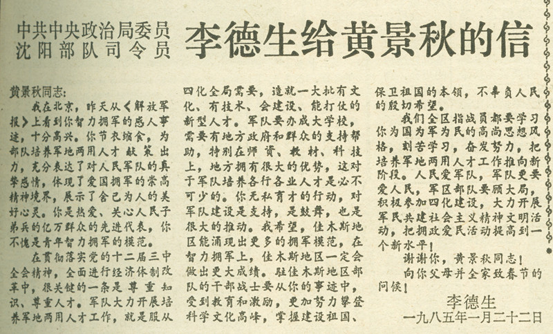 1985年中央政治局委员沈阳部队司令员李德生给全国智力拥军模范黄景秋的信