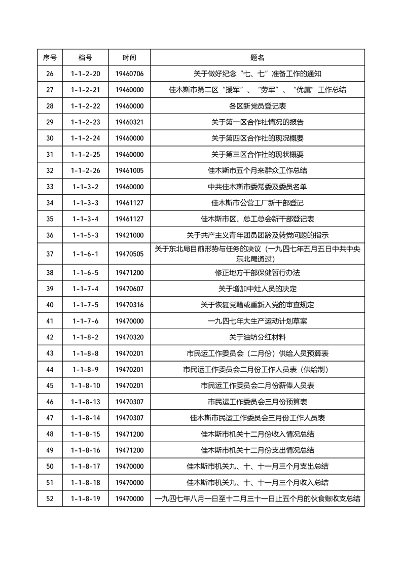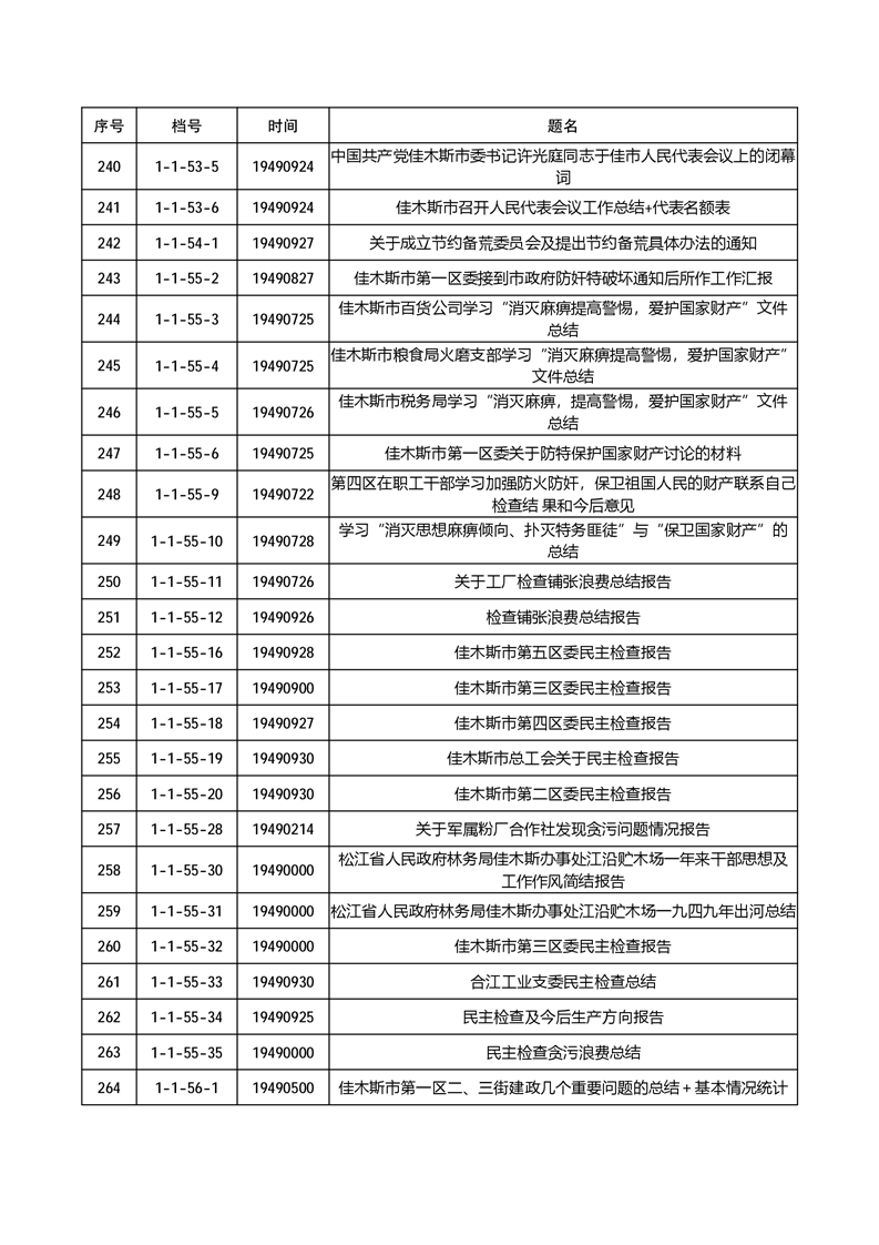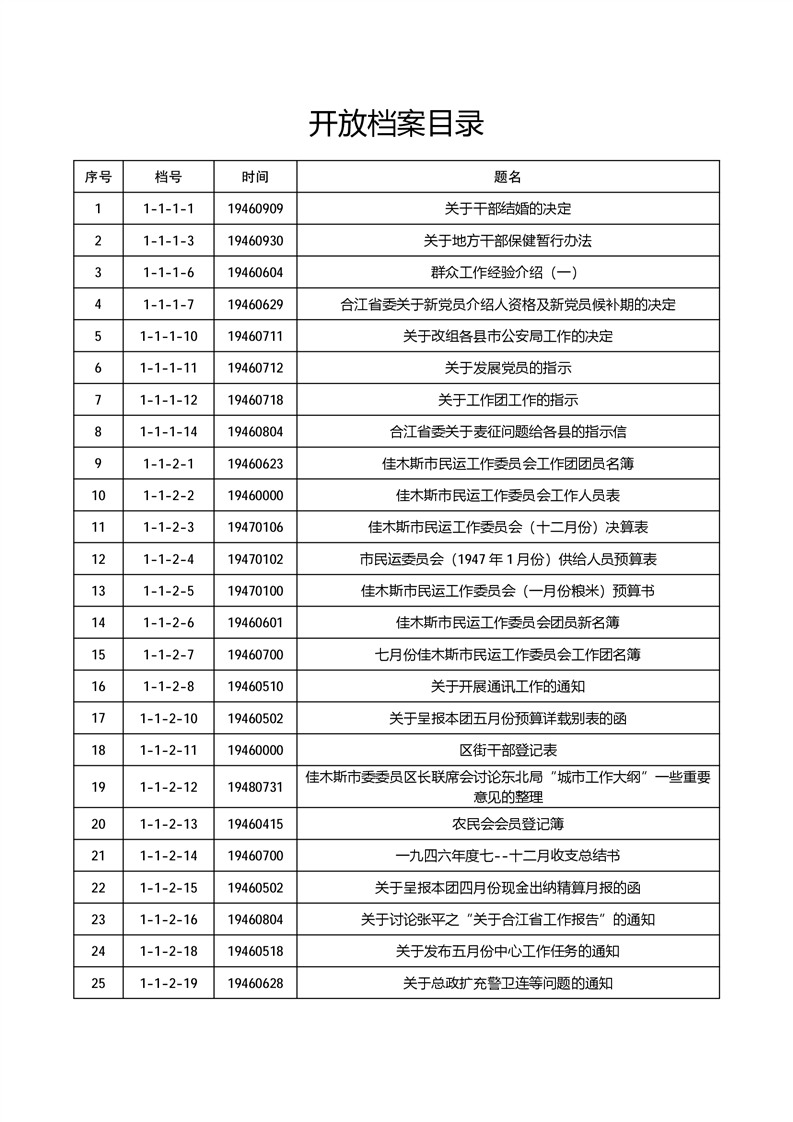 为有效发挥档案信息资源服务社会和民生作用,根据《中华人民共和国档案法》《中华人民共和国档案法实施条例》《国家档案馆档案开放办法》等有关规定,佳木斯市档案馆依法分两批开放馆藏革命历史档案270件,开放档案包括佳木斯市革命历史时期的政务、经济、社会治理等方面内容。现将公开档案目录向社会公布,单位和个人持合法证明,均可到佳木斯市档案馆(市委史志研究室)申请利用开放档案。
