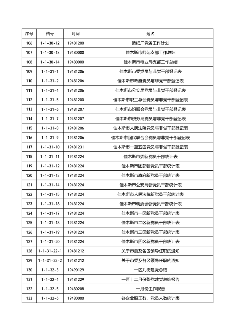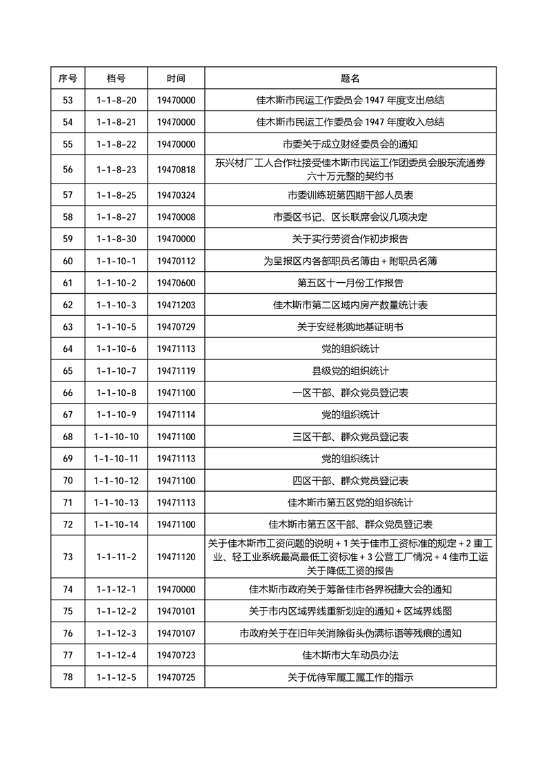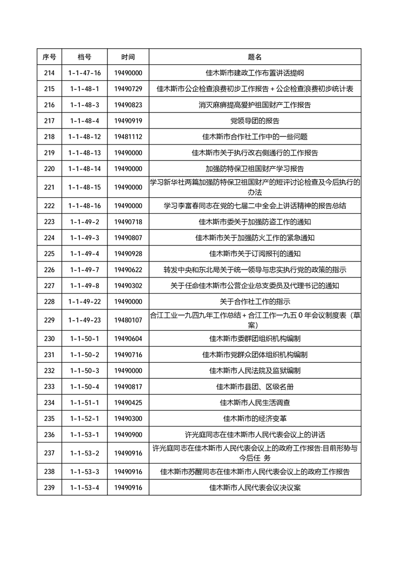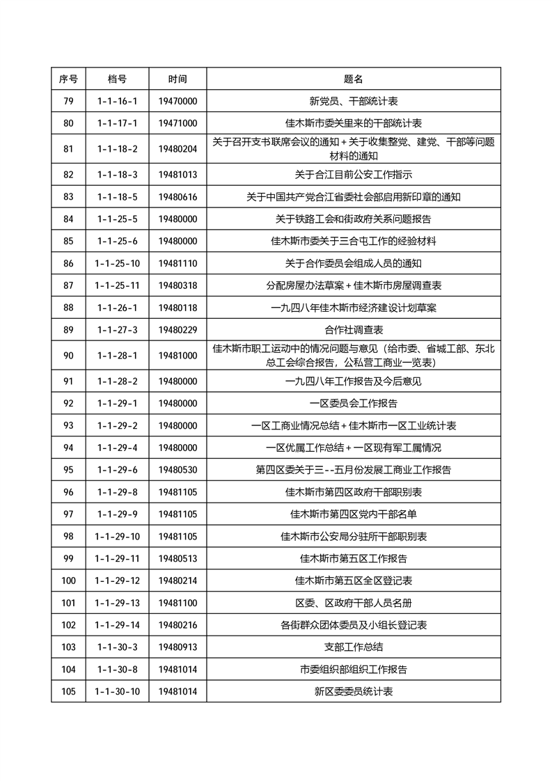 为有效发挥档案信息资源服务社会和民生作用,根据《中华人民共和国档案法》《中华人民共和国档案法实施条例》《国家档案馆档案开放办法》等有关规定,佳木斯市档案馆依法分两批开放馆藏革命历史档案270件,开放档案包括佳木斯市革命历史时期的政务、经济、社会治理等方面内容。现将公开档案目录向社会公布,单位和个人持合法证明,均可到佳木斯市档案馆(市委史志研究室)申请利用开放档案。